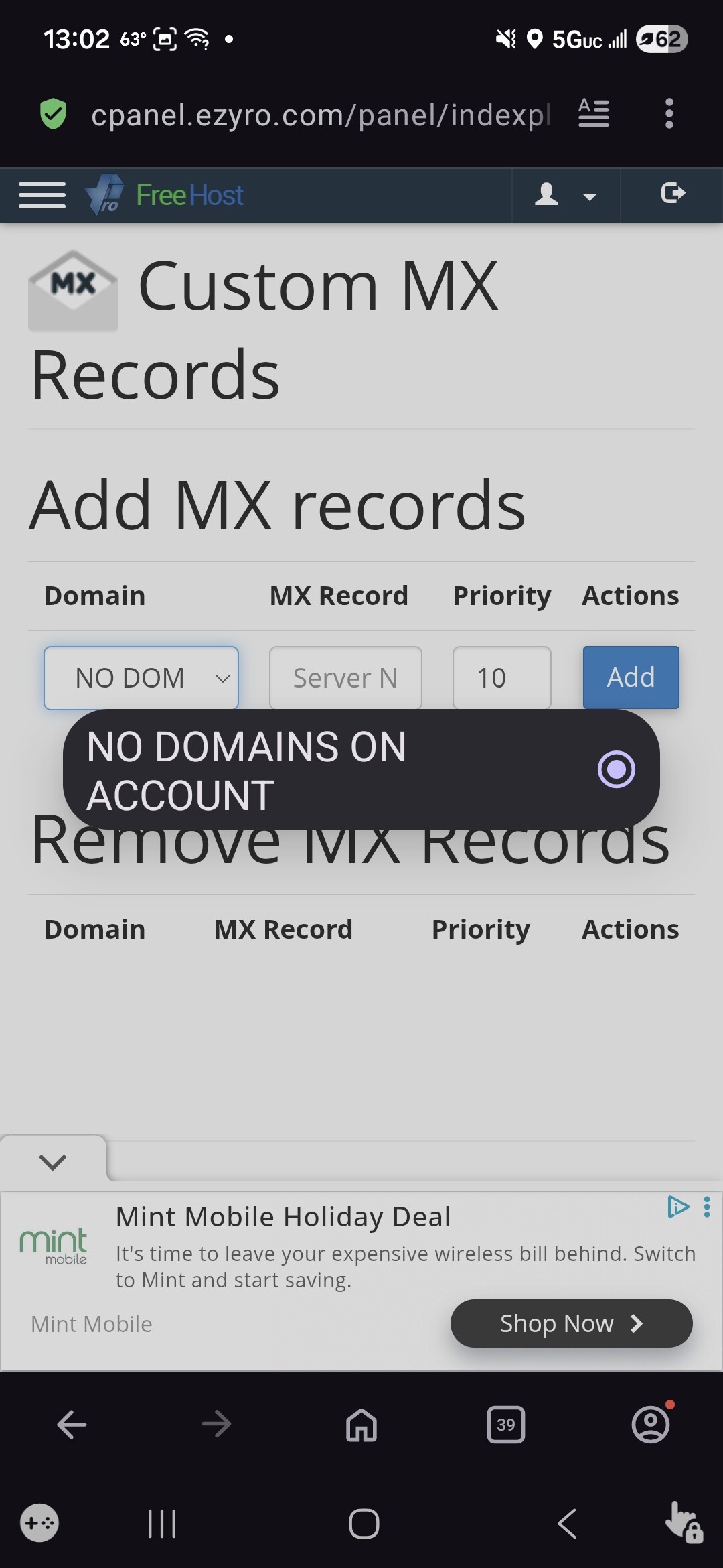 Hello I’m trying to set up an email with zoho mail. However the MX record shows no domains on account so I can’t add one. I have done this in the past but it doesn’t seem to work now.